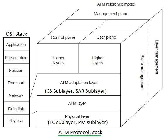 The ATM layout incorporates a robust structure to define the purpose of the system in detail. The functionality of ATM works in correlation with the physical layer along with the part of the data link layer of the OSI reference model. The figure given here depicts how ATM Reference Model works in relation with the Lowest Two Layers of the OSI Reference Model.